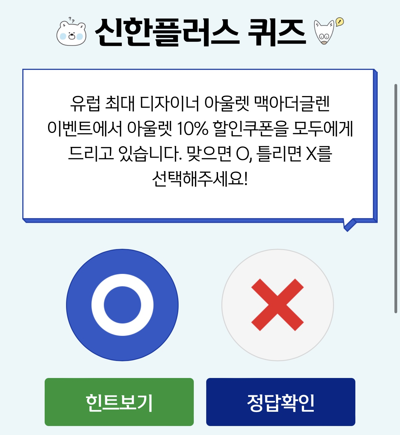 신한플레이 오늘의 OX퀴즈는 '신한플레이'어플 하단 탭 "혜택"->오늘의 OX퀴즈(퀴즈 팡팡)에 있습니다.