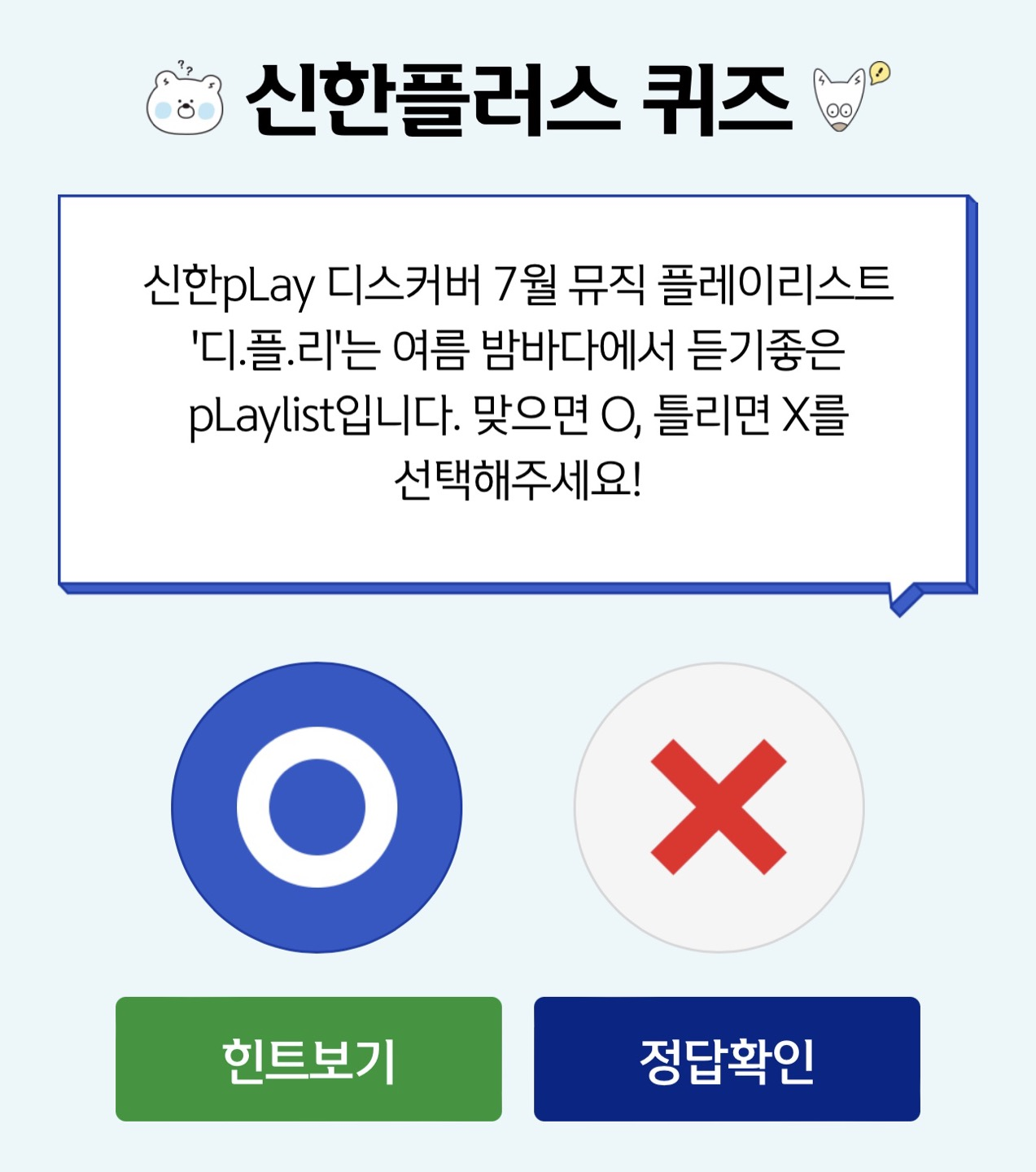 신한pLay 디스커버 7월 뮤직 플레이리스트 '디.플.리'는 여름 밤바다에서 듣기 좋은 pLaylist 입니다. 맞으면 O, 틀리면 X를 선택해주세요.